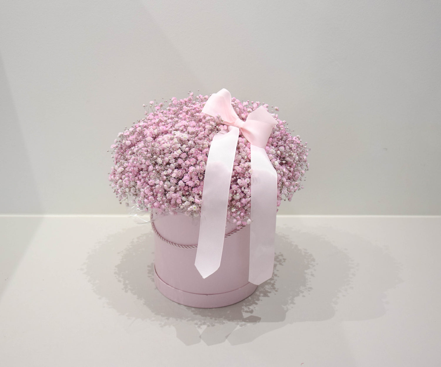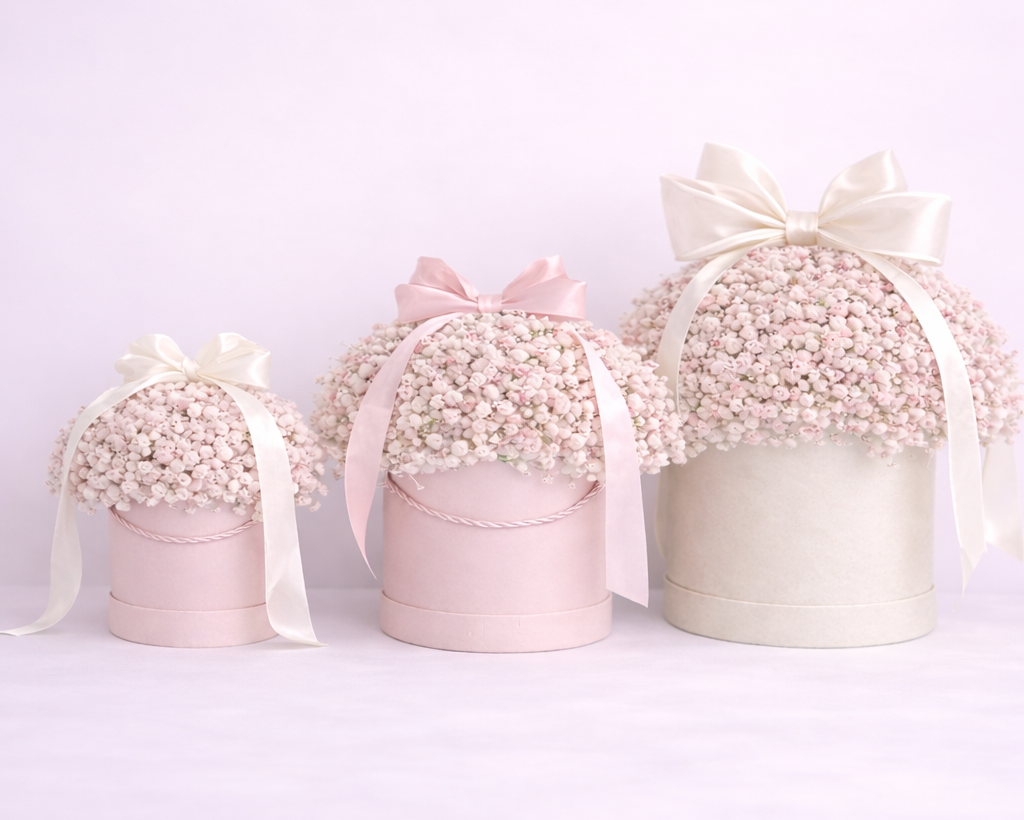 Flower boxy z gipsówką to delikatne i eleganckie kompozycje kwiatowe w pudełku,...